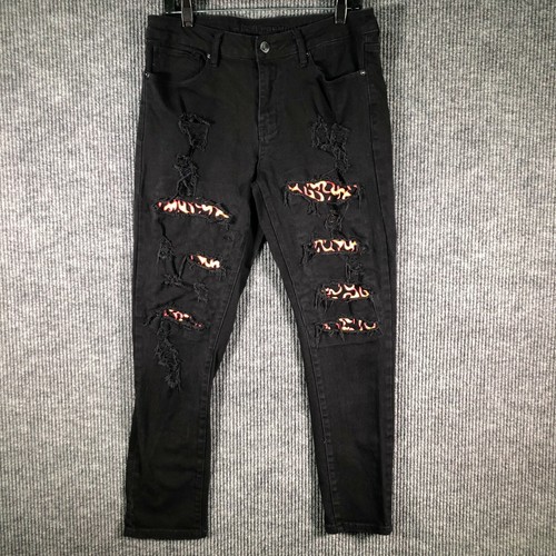 Rue21 Premium Mens Black Distressed Stretch Jeans 32 30 Flame Patched Ebay